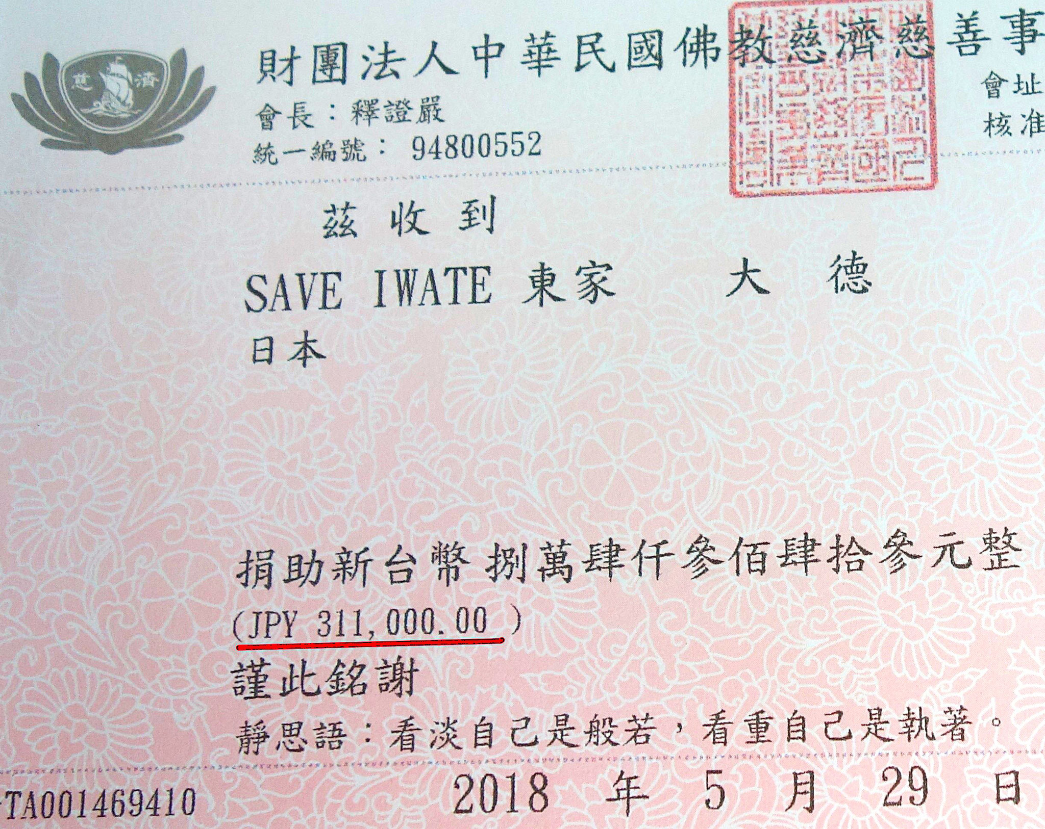 募金活動は11月10日まで行い、11月13日花蓮に本部を置く慈済基金会に直接お届けします。